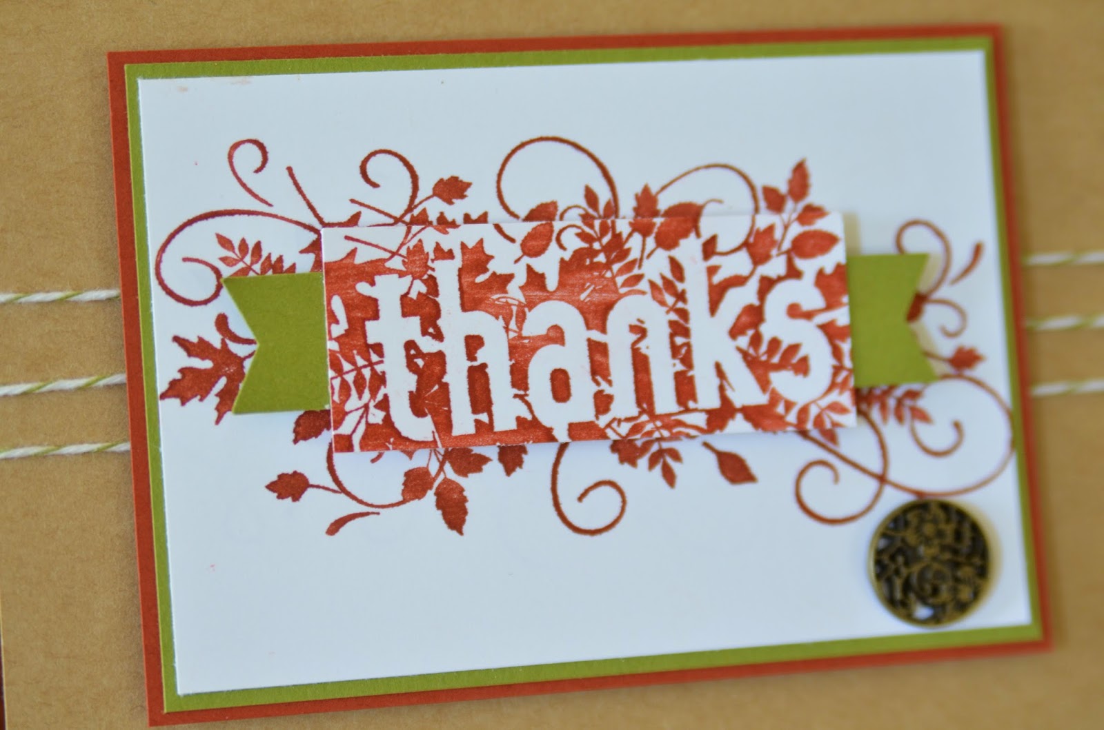 I layered Cajan Craze (bottom layer) with Old Olive on top and then Whisper White as my very top layer. I stamped the "thanks" thank from Seasonally Scattered by Stampin' Up! (LOVE IT!) twice. The first stamp is on the base layer of Whisper White and then on scrap paper I stamped it again and cropped around just the "thanks". Flagged each end in Old Olive and popped it all up on Stampin' Dimensionals. I added an Antique Brad accent to the bottom left. Behind all of that I wrapped Old Olive Bakers Twine 3 times before popping it all up on Stampin' Dimensionals.